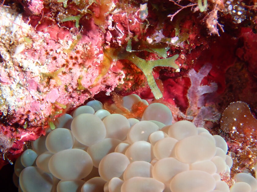 和名はミナミクモガニでブドウのような形をしたお家のミズタマサンゴは別名バブルコーラル!実は触手の中に褐虫藻を飼っていて、光合成をしているんですよ。触れたくなるような透明感が魅力ですね