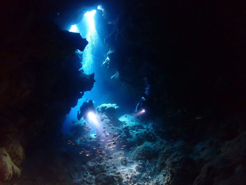 洞窟の隙間から差し込む光とダイバーの水中ライトがーザービームのように神々しく、幻想的な景色が地形ポイントの醍醐味!