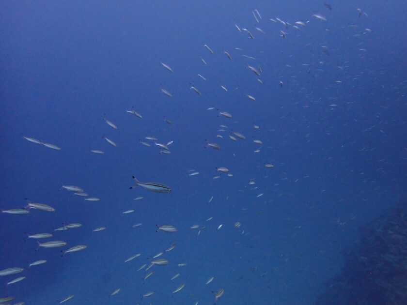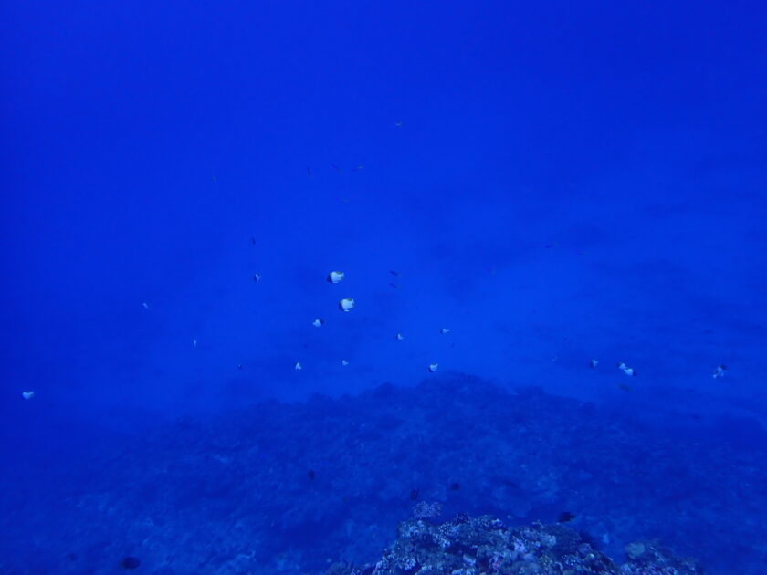 リーフエッジで群れる姿が特徴で外海からの新鮮な水が流れ込む場所を好み、動物プランクトンを捕食します。海の豊かさを象徴する光景の一つです。白と青の体色が、透明度の高い海に映えて本当に綺麗です。潮の流れに乗って優雅に泳いでいました。