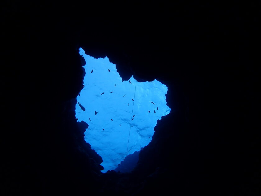 闇を抜けた先に広がる、吸い込まれるようなコバルトブルー。洞窟の中から見上げる水面の輝きと、魚たちのシルエットが織りなす光景は、まさに自然が作った芸術作品。
