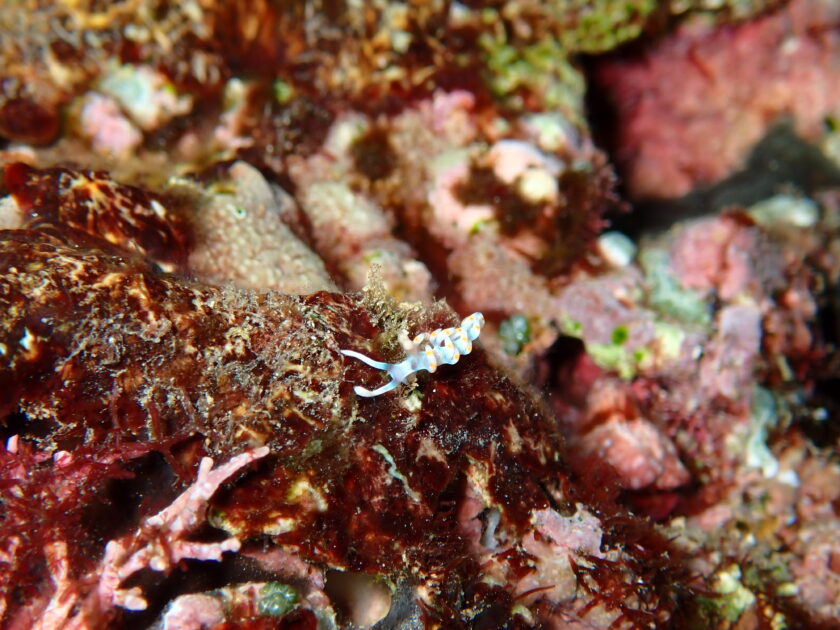 ムカデミノウミウシのヒラヒラとした突起は「ミノ」と呼ばれ、呼吸や防御の役割を果たします。鮮やかな体色は、外敵に毒があることを知らせる警戒色です毒のある刺胞を取り込んで身を守る、美しいけれどたくましい海の宝石。岩場をゆったり散歩中でした。