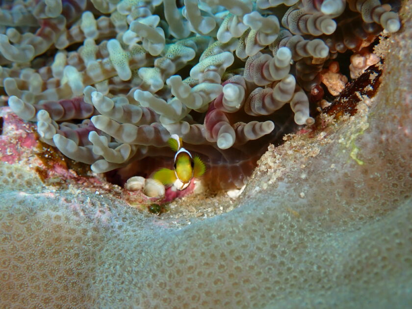 イソギンチャクと密接な共生関係にあるクマノミ。粘液で毒を回避し、隠れ家として利用する代わりに、外敵を追い払う。そんな自然界の協力関係を間近で観察。