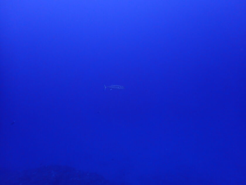ラストは中層を回遊するイソマグロに遭遇!弾丸のようなフォルムと力強い泳ぎは、まさに海の王者の風格!時速70キロ以上で泳ぐこともある高速の捕食者が青い深淵から突如現れるその姿は、ダイバーにとって憧れの的。食物連鎖の頂点に近い、力強い個体でした。無駄のないフォルムで空間を切り裂き、悠々と去っていく。その圧倒的な生命の輝きに、自然への敬意を抱かざるを得ません。新年早々、大物との出会いにチーム全員大興奮でしたぁ(^^)/