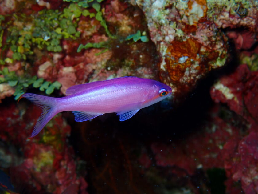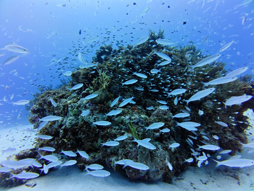 根にはグルクンやスカシテンジクダイ、ヨスジフエダイの群れ