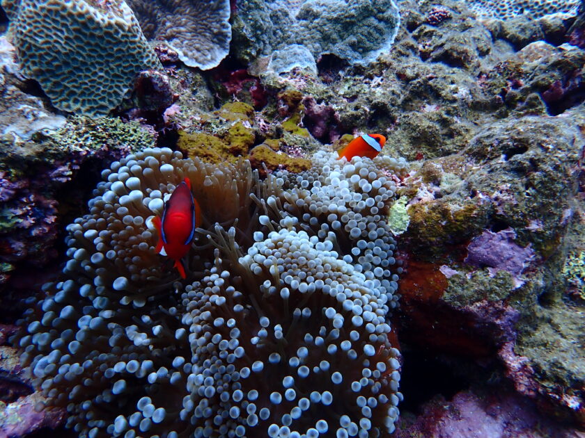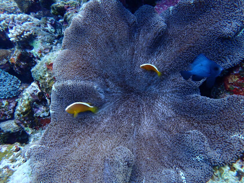 イソギンチャクの白い触手とのコントラストがめっちゃ綺麗。一本線のラインが特徴で、クマノミ界でも一番気が強いことで有名です!