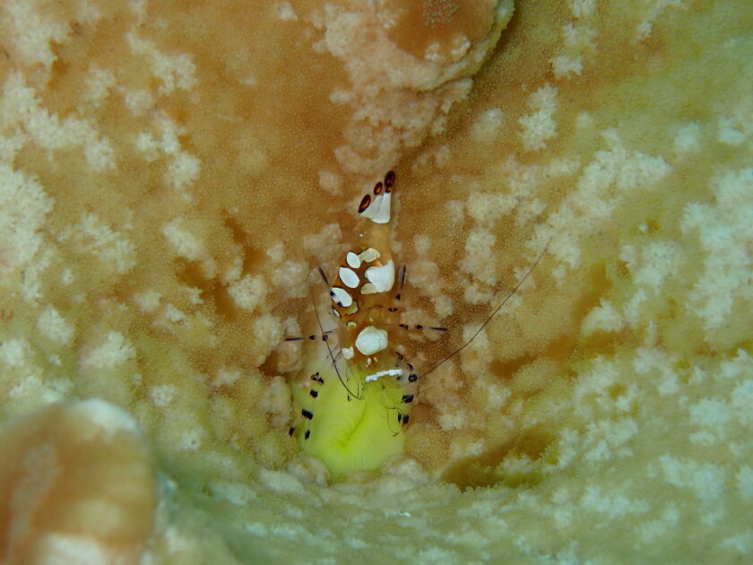 トゲには毒があるので、絶対タッチはNGでサンゴを食べちゃ悪者的存在ですがこの幾何学的なフォルムは水中写真の被写体としてはインパクト絶大! お洒落なデザインのイソギンチャクエビ