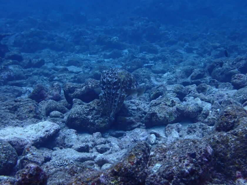周りの岩に擬態してじっとしてる大きな体で優雅にホバリングする姿は、まるで水中の宇宙人みたい!これから春にかけてユビエダハマサンゴなどの産卵場で求愛&産卵シーンを見せてくれるコウイカの仲間です!