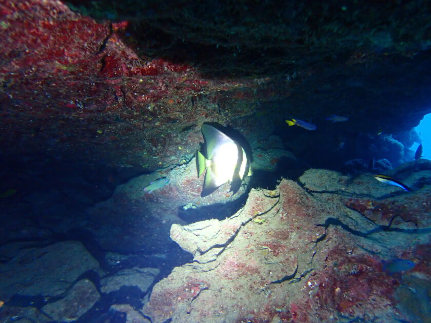 この平べったい体と大きなヒレ、いつ見ても優雅で洞窟のシルエットと重なり、水中ライトで照らすと、銀色の体が神々しく輝いていましたよ!