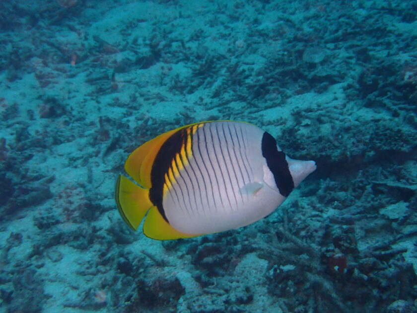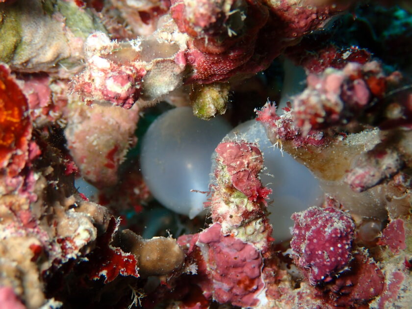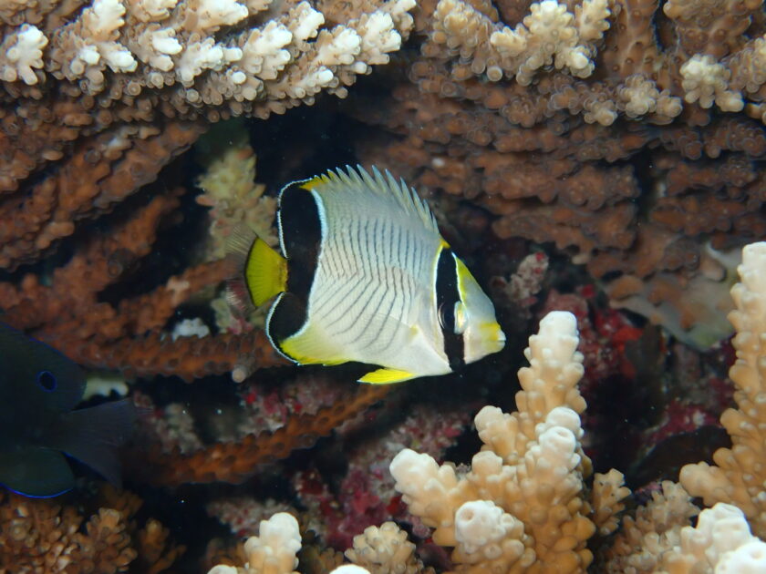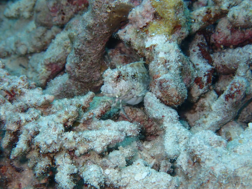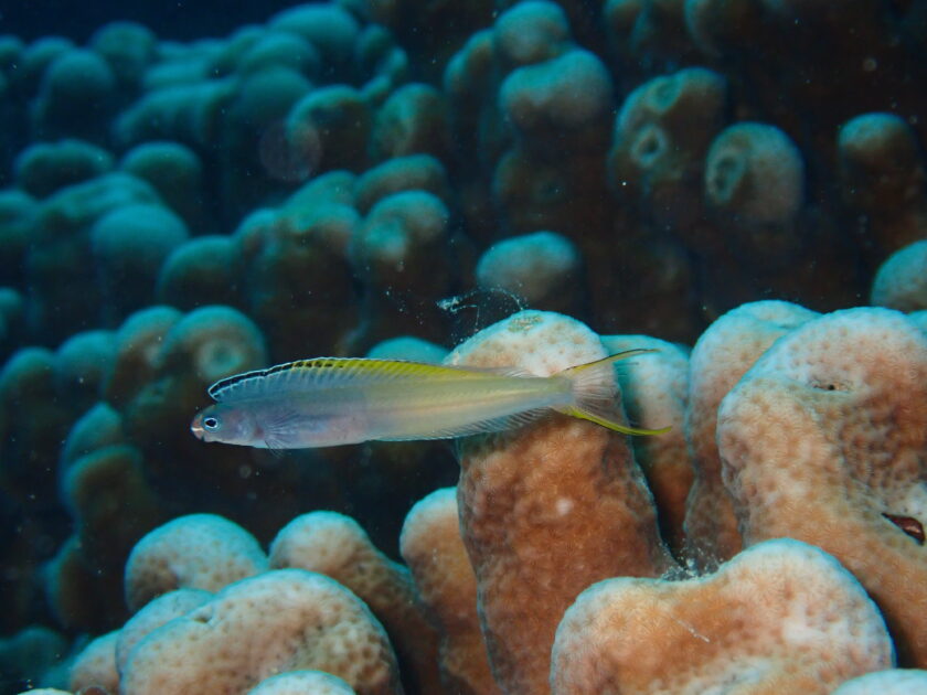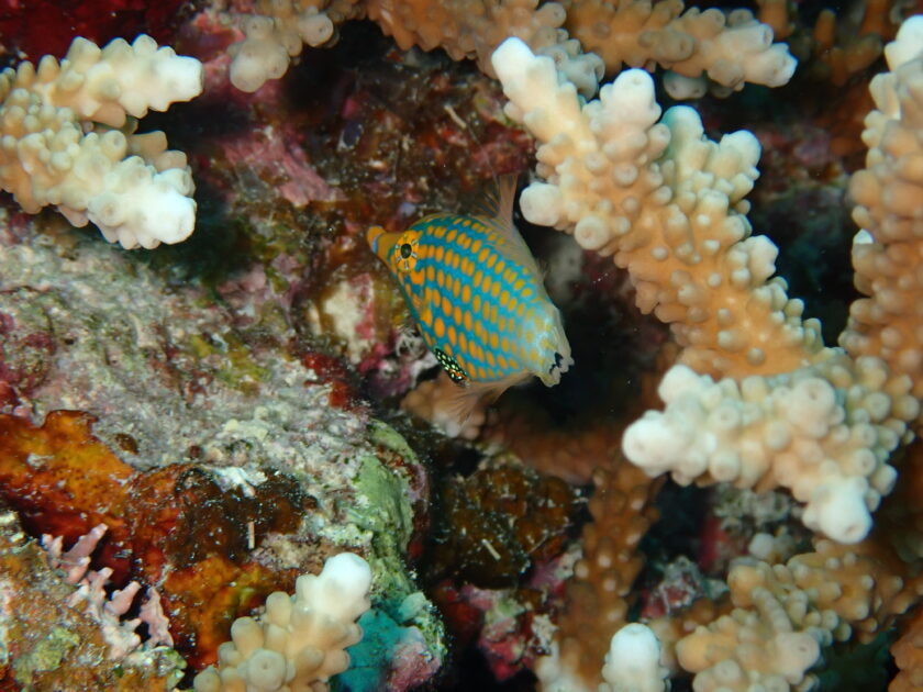 いつも枝サンゴの隙間を逆立ちで移動してるテングカワハギ