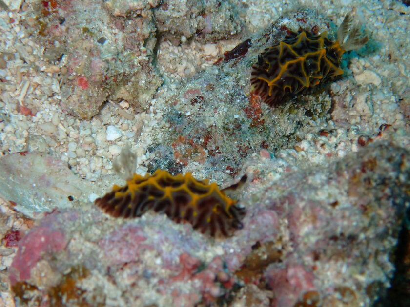 なぜかこのエリアに多いパイナップルウミウシ!もうすぐ出会いそうな2匹のペアでした♡