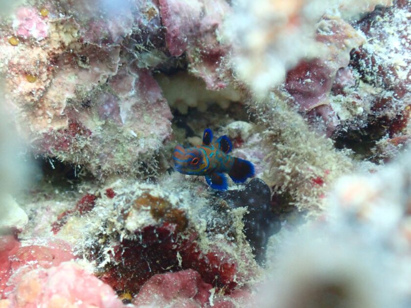 ヤツデアナサンゴモドキのサンゴの影からこっそり覗いているのは、ダイバーに大人気のマンジュウイシモチ。名前の通り「おまんじゅう」のような丸いフォルムと、イチゴ柄のパンツを履いたようなドット模様が愛くるしさ満点です!臆病な性格なので、サンゴの隙間でじっとしていることが多いのですが、今日はゆっくり観察させてくれました。その愛らしい瞳に見つめられたら、もうメロメロです♡
