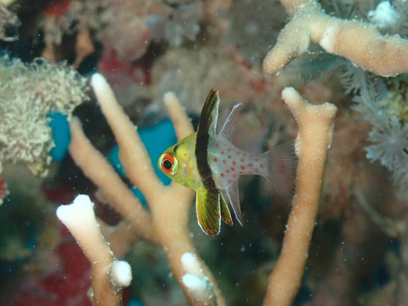 ヤツデアナサンゴモドキのサンゴの影からこっそり覗いているのは、ダイバーに大人気のマンジュウイシモチ。名前の通り「おまんじゅう」のような丸いフォルムと、イチゴ柄のパンツを履いたようなドット模様が愛くるしさ満点です!臆病な性格なので、サンゴの隙間でじっとしていることが多いのですが、今日はゆっくり観察させてくれました。その愛らしい瞳に見つめられたら、もうメロメロです♡ ウスモモテンジクダイの群れ