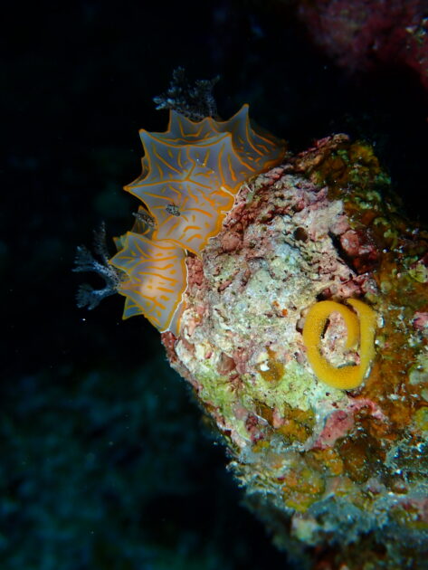幾何学的なオレンジのラインが美しい!隣には黄色い渦巻き状の卵塊も。産卵シーンに立ち会えるのは、冬のダイビングならではで実に贅沢ですね。