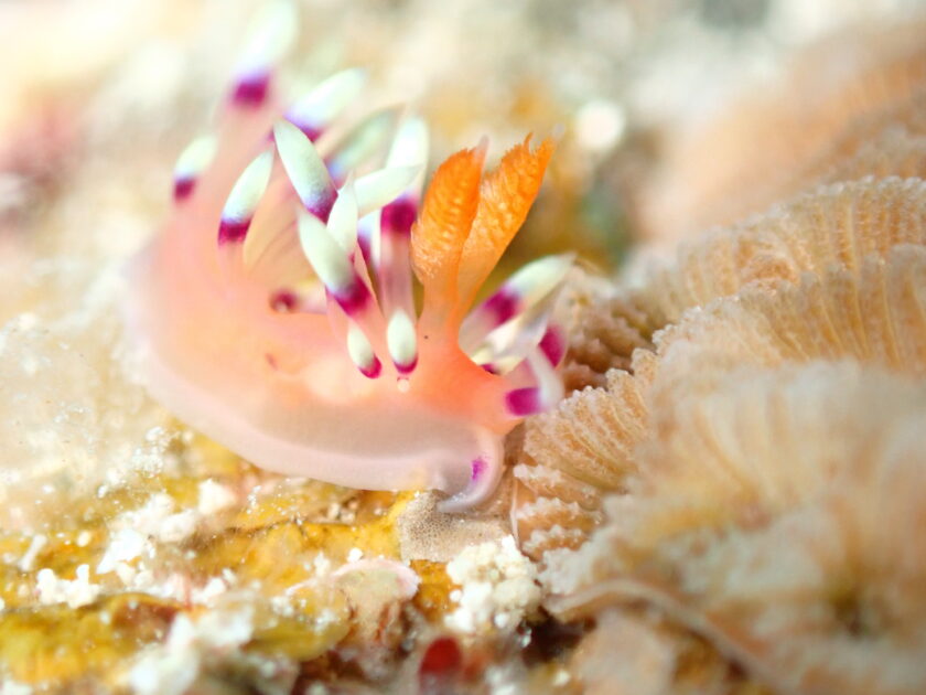 その名の通り、ピンクの体と紫の触角がとっても艶やか。水中で揺れるミノが繊細で、マクロ写真派にはたまらない被写体ですねー!背景をぼかして、ピンクの個体を際立たせました。触角の紫色の先端にピントを合わせるのが、可愛く撮るためのポイントです。