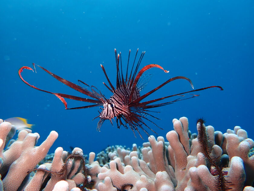青抜きで豪華なひれを全開に。ヒレのラインが放射状に広がる姿は、ダイビングの達成感を感じさせてくれる、迫力満点の被写体で扇のような胸びれを広げて優雅に舞う姿は、まさに海中の貴婦人。毒があるとは思えないほど華やかで、ワイドレンズで狙いたい美しさでした!