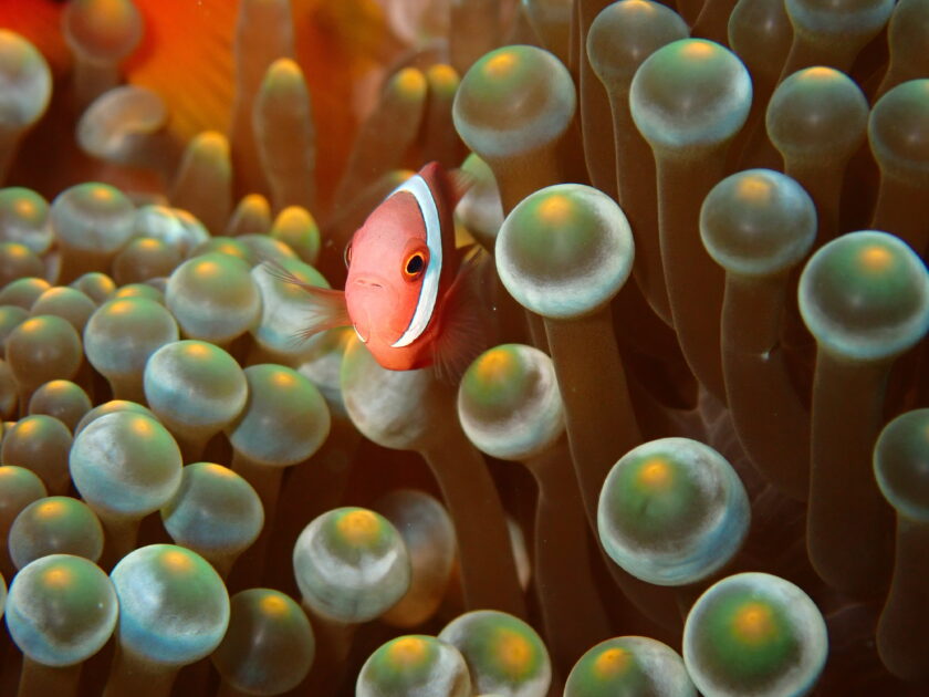 ぷっくりしたイソギンチャクから「こんにちは」。1本帯の凛々しい姿がトレードマーク。鮮やかなオレンジ色が青い海によく映えますねー!触手の中から覗く瞳をキャッチ。あえて周囲を暗く落とすことで、ハマクマノミの燃えるような赤色をより引き立たせることができます。
