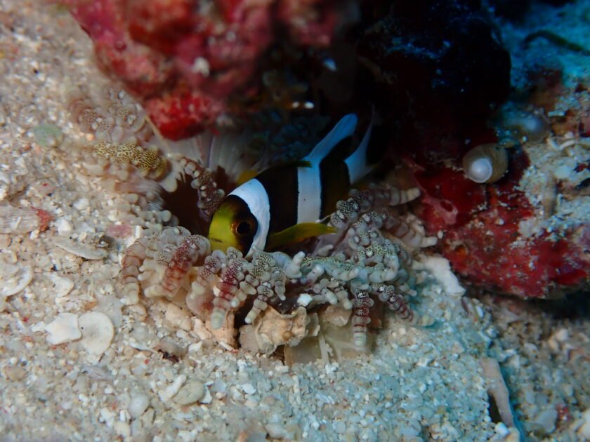 ガレの斜面にポツンとミニサイズのイソギンチャクベッドでひと休み。2本の白いバンドが特徴で、こちらを警戒しつつも顔を出す健気な姿に、思わずシャッターを切りました。イソギンチャクの「触手の海」に埋もれる瞬間を。魚の表情だけでなく、揺れる住み家の柔らかさも表現したい、ダイバー憧れの構図です