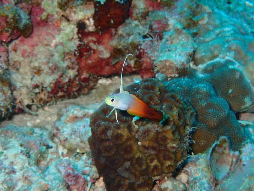 長い背びれをピコピコ動かす仕草がキュート!近づくとすぐに穴へ隠れてしまうシャイな子ですが、今日はじっくり観察させてくれました。白と赤のグラデーションが絶景。背びれが一番高く上がった瞬間がシャッターチャンス。砂地の反射を利用して明るい仕上がりに。