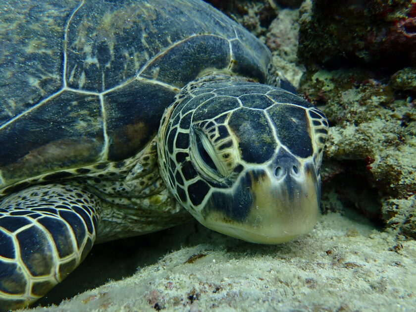 リラックス中の大崎のカメは至近距離でも動じない落ち着きは、まさに海の守り神。つぶらな瞳で見つめられると、時が経つのを忘れてしまいます。岩に顎を乗せて休む姿は、まるで「お疲れ様」と言ってくれているよう。カメと一緒に泳ぐ時間は、何よりのご褒美ですね!