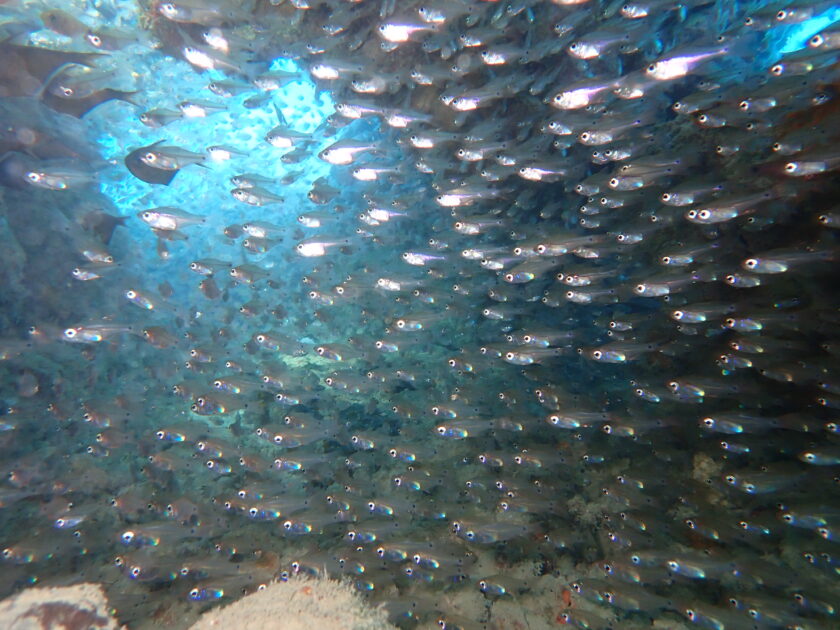 大きなハマサンゴの割れ目の中は銀色のシャワー!太陽の光が差し込むブルーの背景に、小魚の群れがキラキラと反射する光景は、息を呑むほど幻想的!透過する体をライトで透かすと、まるで宝石のような輝きを放ち、神秘的な一枚になりました(^^)/