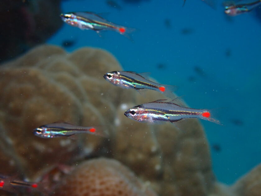 大きなハマサンゴの割れ目の中は銀色のシャワー!太陽の光が差し込むブルーの背景に、小魚の群れがキラキラと反射する光景は、息を呑むほど幻想的!透過する体をライトで透かすと、まるで宝石のような輝きを放ち、神秘的な一枚になりました(^^)/ 尾びれの付け根にある赤い点がチャームポイント