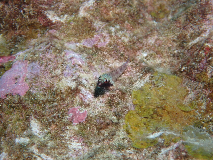 根の上でじっとしているのはヘビギンポの仲間。カモフラージュが得意ですが、赤い体色はまるでクリスマスのデコレーション。一生懸命に岩を掴む小さなヒレが、なんとも健気で可愛らしいポイントです。