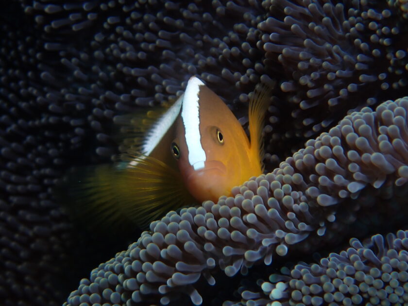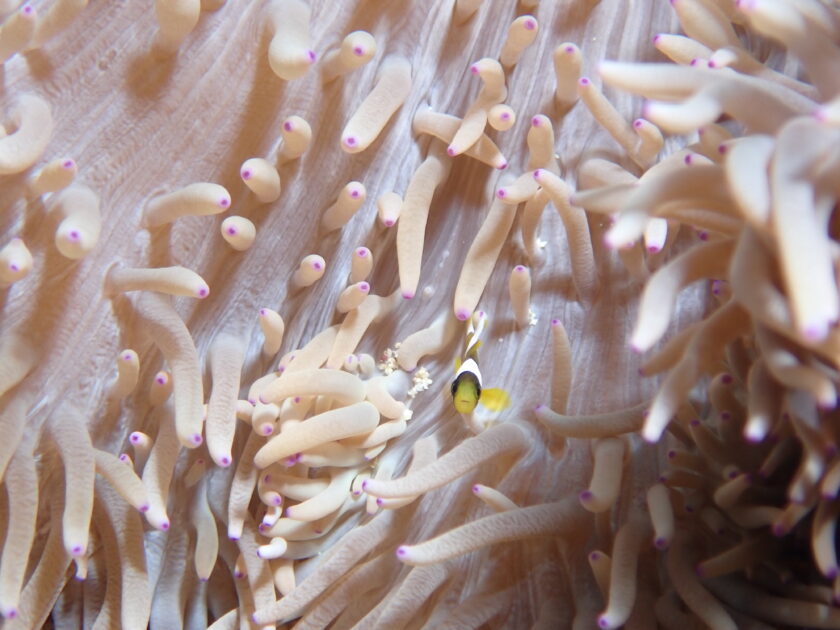 最後はセジロクマノミがドアップでご挨拶。白いラインがチャームポイントの彼らは、少し恥ずかしがり屋。イソギンチャクのベッドから顔を出して、今日のダイビングを見送ってくれているようでしたぁ(^^)/