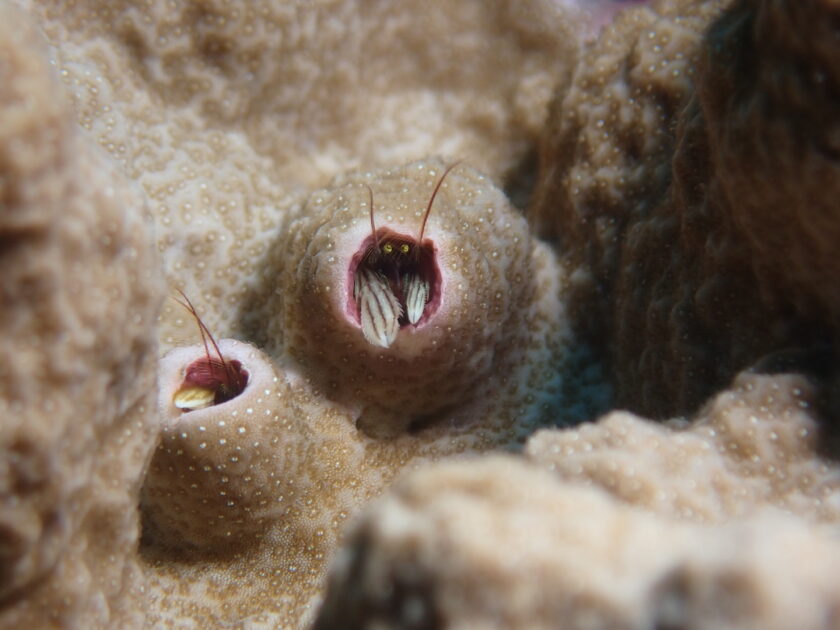 サンゴの穴からひょっこり顔を出しているのは、カンザシヤドカリ。つぶらな瞳でこちらを観察しています。「外は賑やかだなぁ」なんて思っているのでしょうか?小さな穴の中の、静かなクリスマスですね。