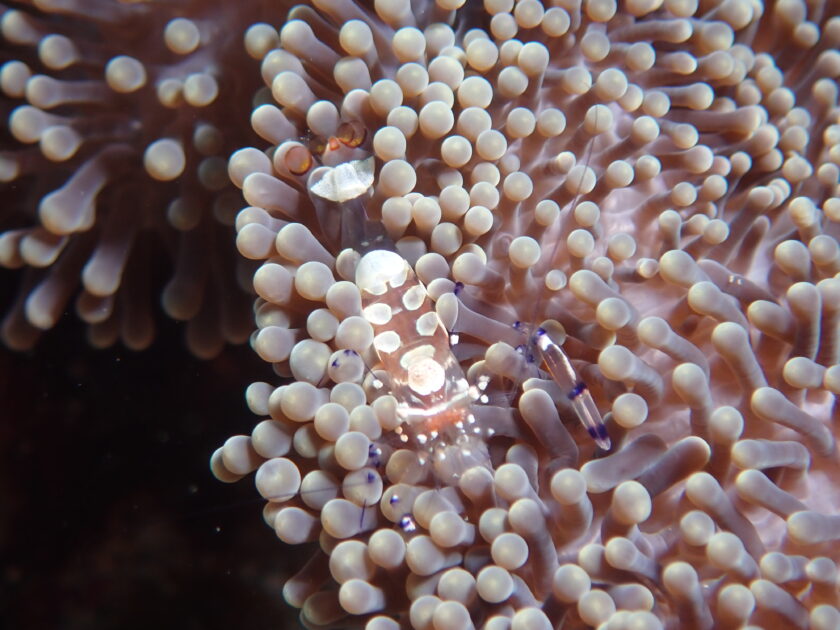 イソギンチャクの上では、透明な体が美しイソギンチャクエビがゆらゆら。まるでおしゃれなオーナメントのようです。毒のある触手の中でも平気な顔でダンスする姿は、いつ見ても不思議ですね。