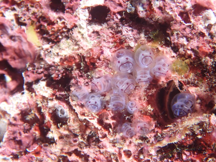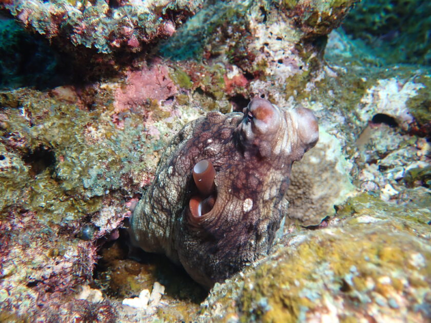 岩の隙間に隠れていたのは、タコ!こちらをじっと見つめる姿は、海の賢者のような風格があります。自由自在に体の色を変えるマジックを見せてくれる、水中界のエンターテイナーですね。