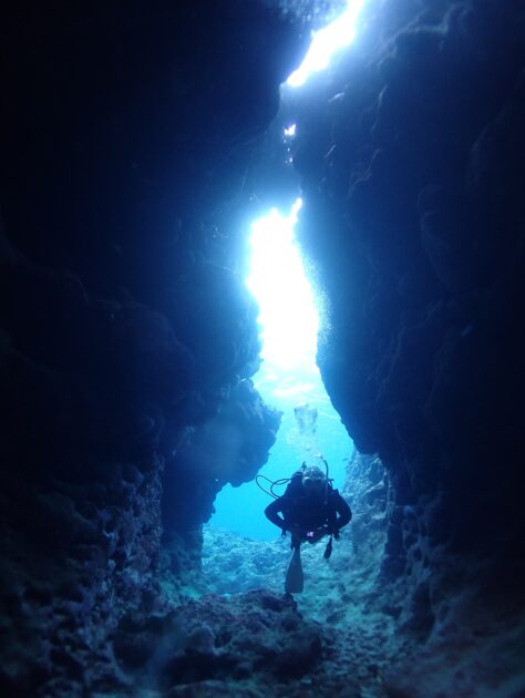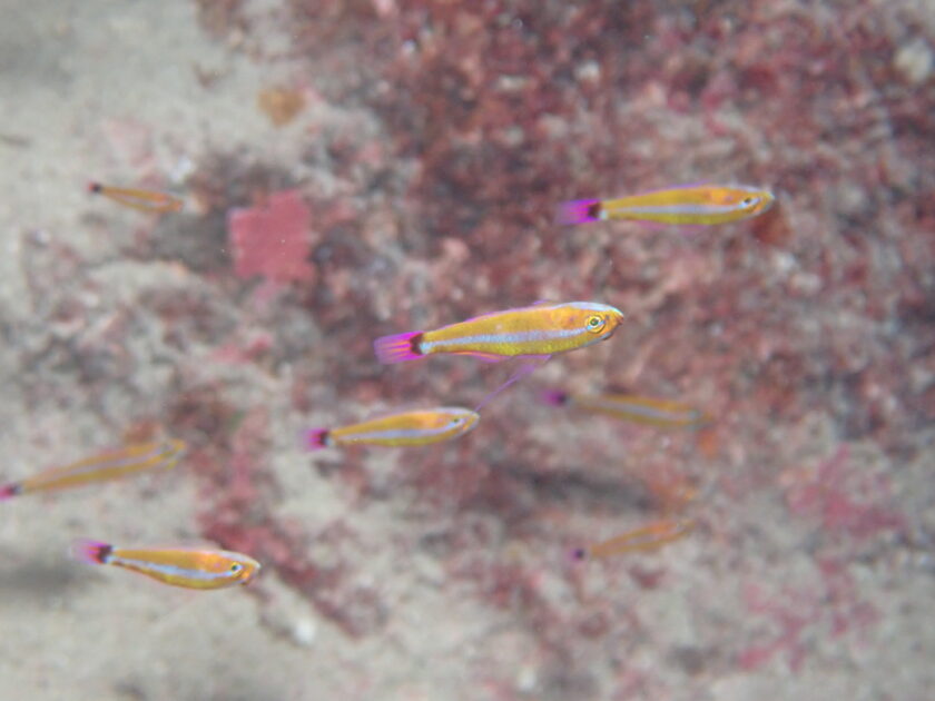 洞窟の隅を舞うのは、色鮮やかなアオギハゼたちの群れ。ピンクや黄色の体が光を反射して、水中を舞う紙吹雪のようです。南国の海ならではの、とっても豪華で華やかな光景に圧倒されました。
