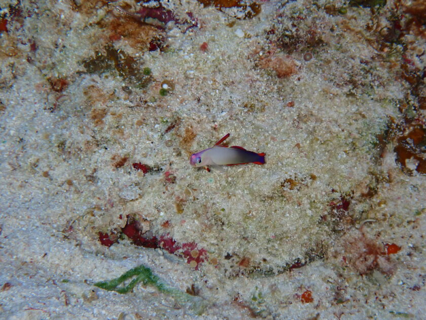 はいさーい!相変わらず窒素は溜まってもお金は貯まらないコーキでーす(^^)/今日は空は少し曇り空ですが、皆さんの熱気で海の上は常夏気分。最高の1日になる予感しかありません!船の上では仲間同士、期待に胸を膨らませて記念撮影!「マンタに会えますように」と願いを込めて、いざエントリー☆彡 気温22℃ 水温22℃ 東~北東の風 雨 【黒島V字ドロップ/タートルリーフ】30m まずは水深を下げてディープな世界で逢えたのはアケボノハゼ! default 赤&紫&白のコントラストが綺麗でピンと立てた背びれをアンテナのように動かす姿が本当にキュート!近づくとすぐに穴に隠れちゃうシャイな子ですが、今日はじっくりとモデルを務めてくれました。 足元に目を向ければ、小さな生命の輝き