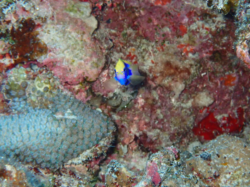 あどけない表情と、鮮やかなイエロラインとブルーの体色が印象的です。石垣島の豊かな生態系が、新しい命を育んでいることを教えてくれる、愛らしい出会いでした。 ドロップオフを彩るのは、ピンク&イエロー色のハナゴンベ。
