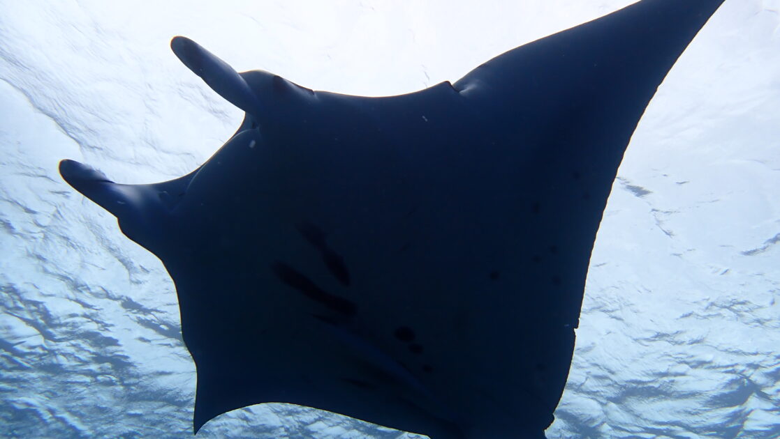 マンタが私たちの真上を通過する大サービス。お腹の模様まではっきりと確認できるほどの大接近に、心拍数は上がりっぱなし。手が届きそうなほどの迫力は、一生の思い出になります。 水面を優雅に羽ばたくマンタのシルエット。