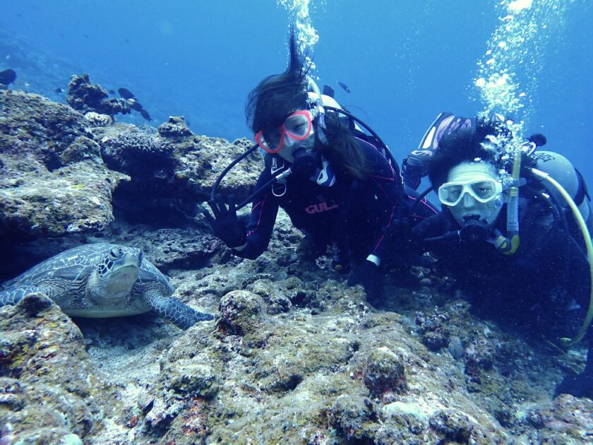憧れのアオウミガメと超至近距離で記念撮影に成功! お昼寝を邪魔しないようそっと寄り添えば、カメさんもリラックスモードです。 マスク越しでも伝わるダイバーお二人の満面の笑みが、最高の1日を物語っていますね! どこまでも続く、どこまでも深い黒島ブルー