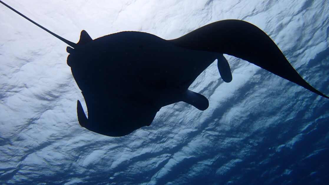 水面近くをゆったりと舞うその姿は、まさに海の王者。逆光でシルエットが浮かび上がり、その大きさと神々しさに圧倒されます。これぞ石垣島のダイビングの醍醐味ですね!
