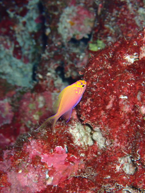 南国の太陽を浴びて輝くような色彩は、海の中の動く花びらのよう。岩の赤色と魚のピンクが混ざり合い、ファインダー越しに鮮やかな世界が広がります。