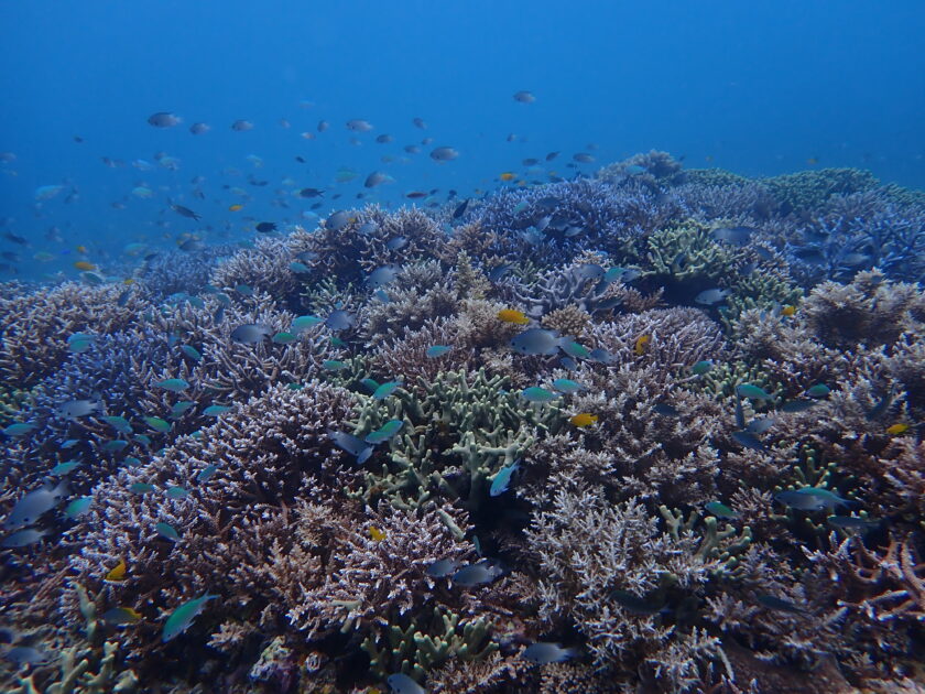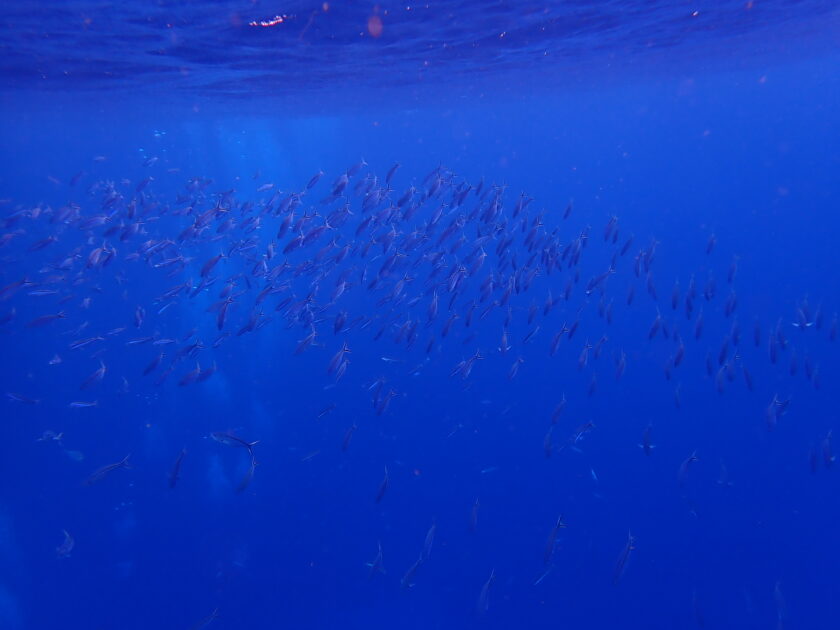 ふと上を見上げると、グルクンの群れがプランクトンに集まってお食事中!冬の黒島ンタの海を予感させる瞬間です。パクパクパクパク・・・