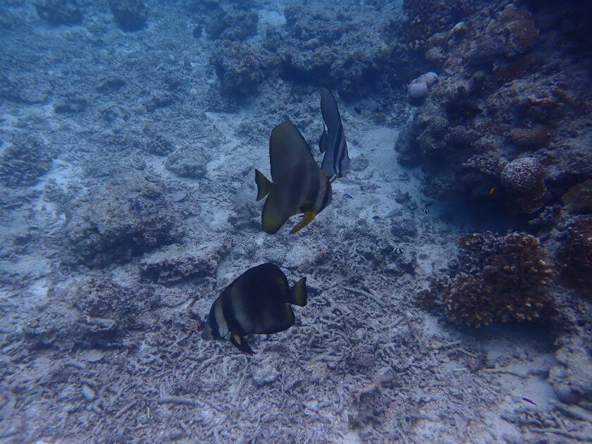 見渡す限りのエダサンゴと、その周りを舞うカラフルな魚たちの群れに圧倒されます。 石垣島の海の豊かさを改めて実感する、透明度抜群のブルーの世界。どこまでも続くサンゴの群生に、光が降り注ぐ幻想的な光景。 自由に泳ぎ回る魚たちのシルエットが、深い青の中に溶け込んでいくようです。 いつまでも眺めていたい、絵画のように美しい楽園の景色に包まれて、心から癒やされる贅沢な景色です。 最後はツバメウオ&アカククリと遭遇。
