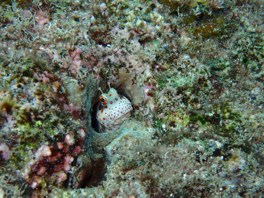 岩の穴から「こんにちは」と顔を出したのは、赤い水玉模様がオシャレなモンツキカエルウオ。