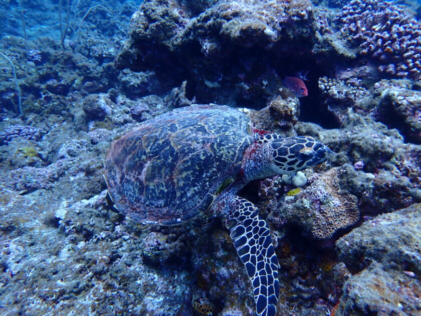 食事中のタイマイに遭遇!甲羅がギザギザで口が尖っているのが特徴の絶滅危惧種です!
