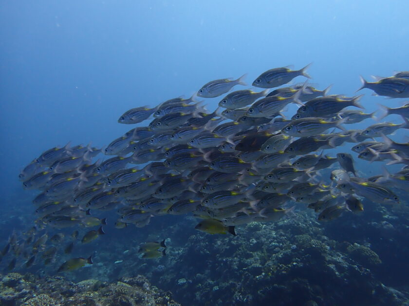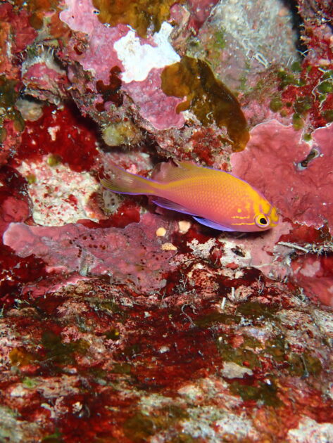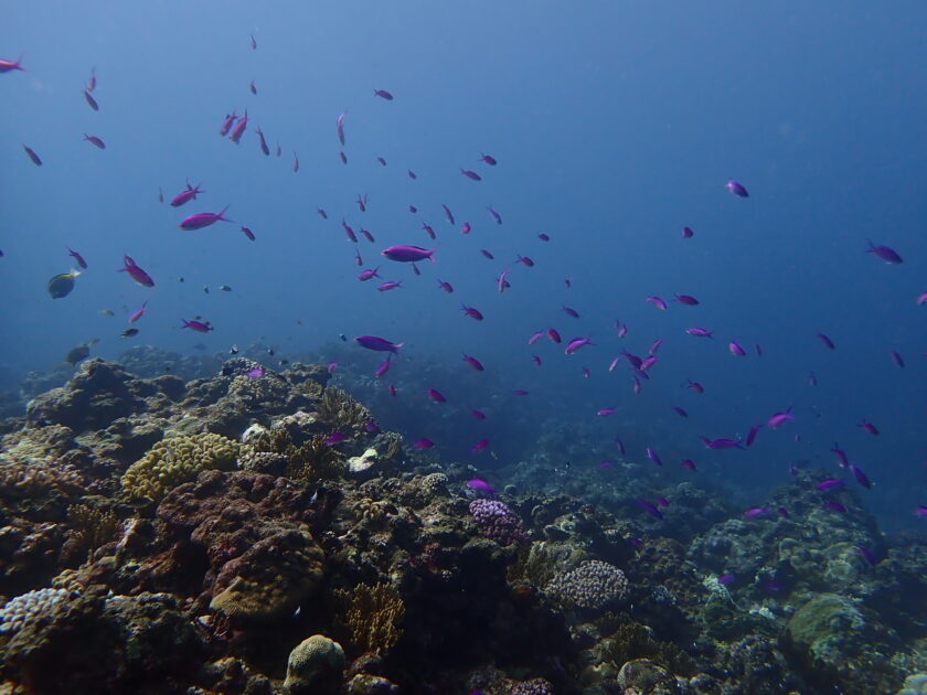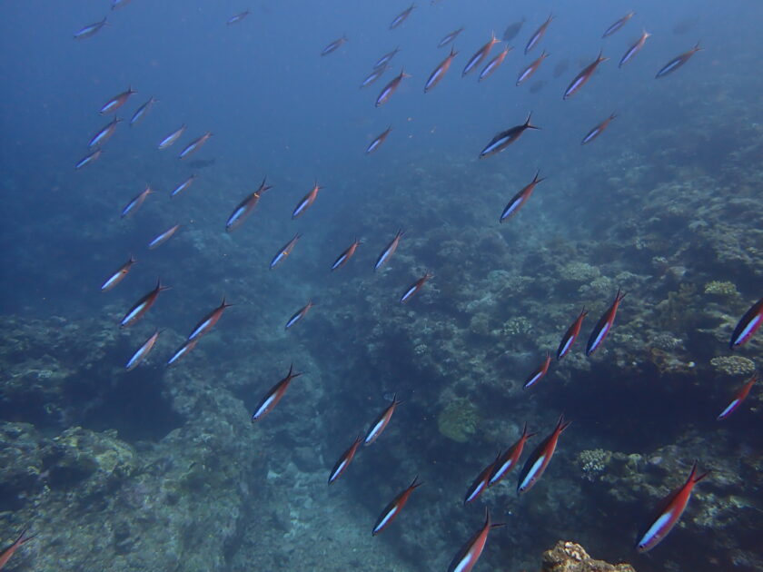 浅い棚上には赤いドット柄のモンツキカエルウオなどなど 【パナリビッグコーナー】透視度20m