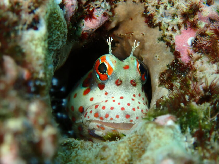 浅い棚上には赤いドット柄のモンツキカエルウオなどなど
