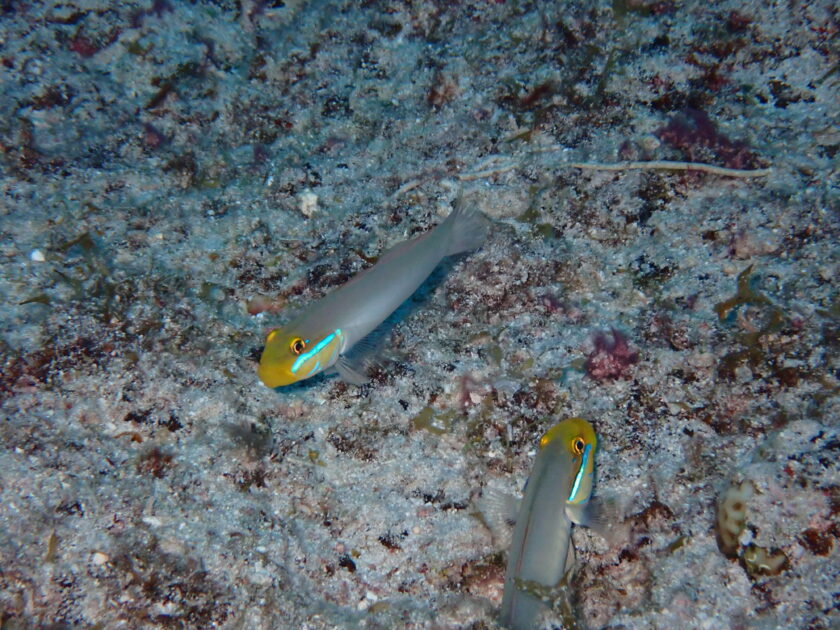 顔が黄色に蛍光ブルーのラインが入ったアカハチハゼ