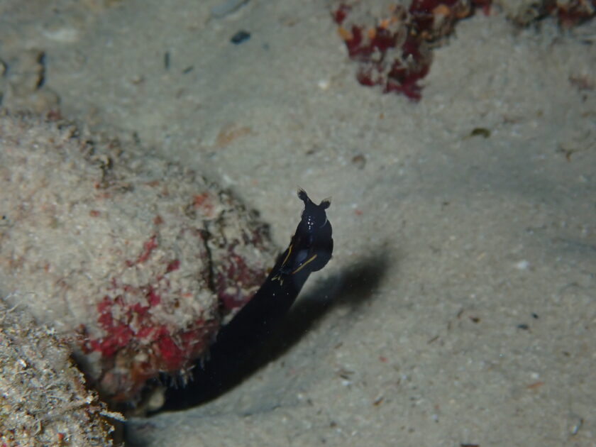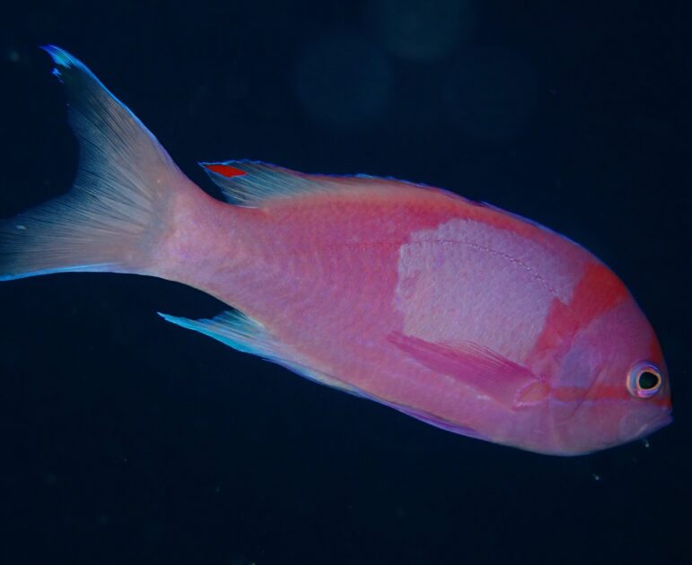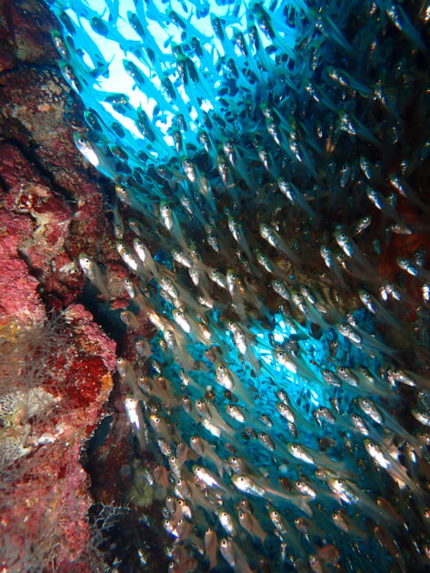 ドロップオフの棚の亀裂にはクロスジスカシテンジクダイの群れて
