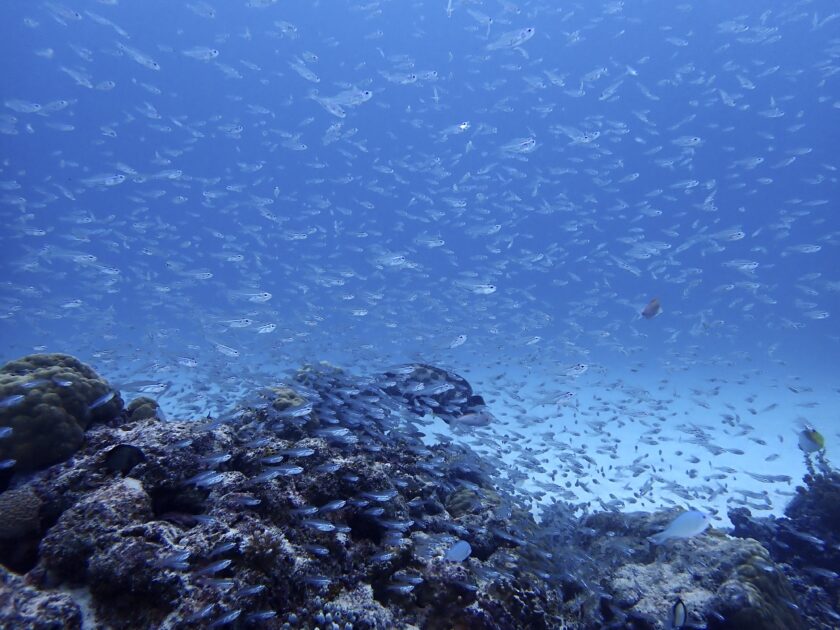 はいさーい!相変わらず窒素は溜まってもお金は貯まらないコーキでーす(^^)/今日はファンダイビング&体験ダイビングで海へGO~☆彡 気温27℃ 水温26℃ 北東の風やや強く 曇り 【竹富島ミドルブック】透視度20m default スカシテンジクダイが群れ群れでキラキラキラ~