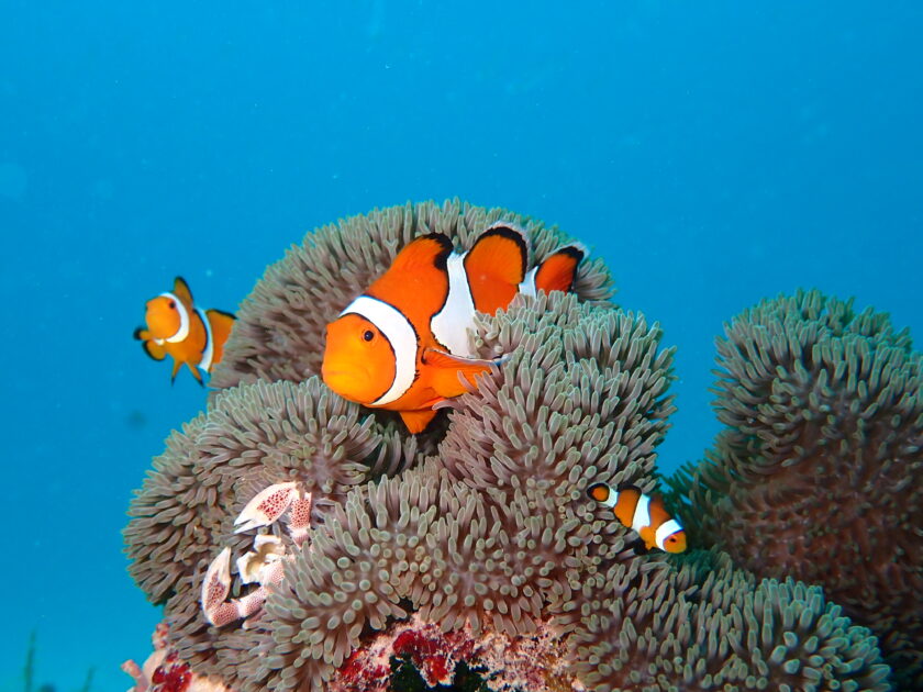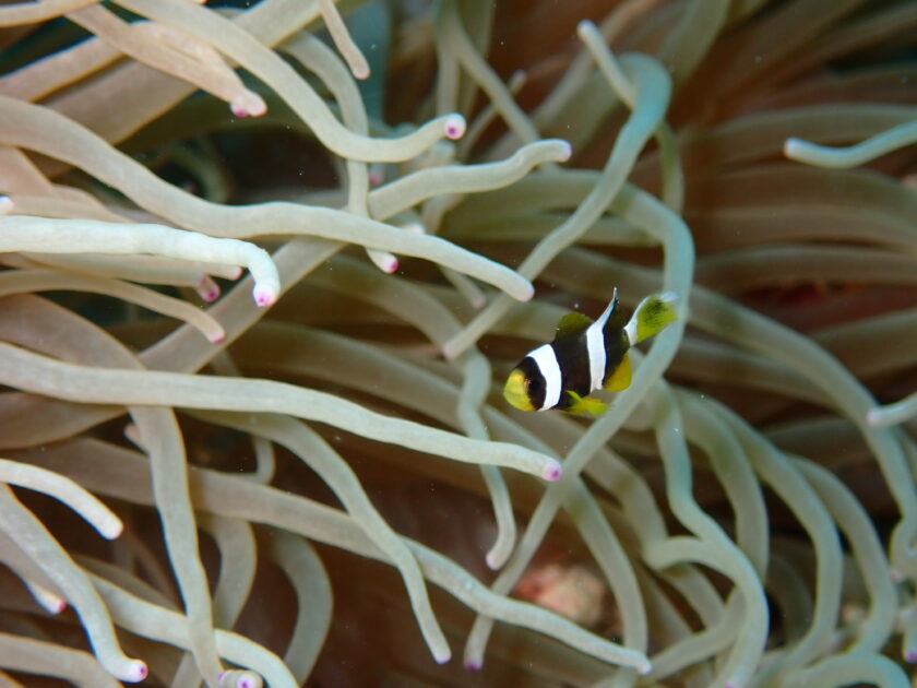 イソギンチャクが小さくて隠れられないカクレクマノミ&アカホシカニダマシ