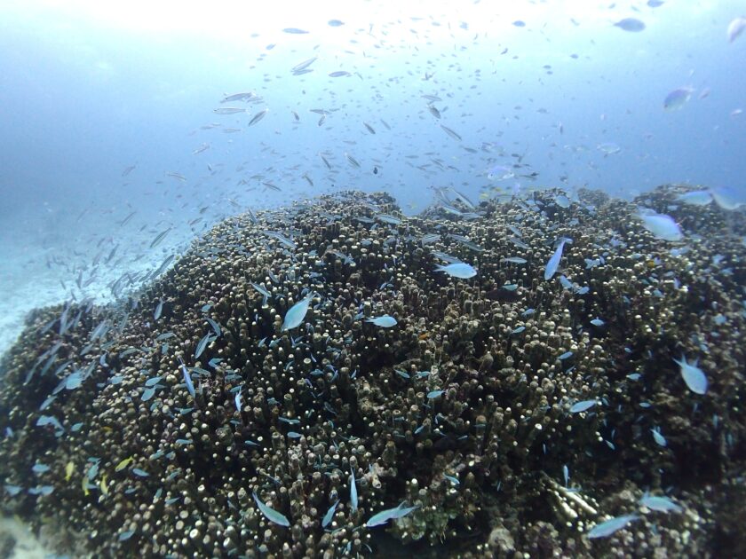 メインのジャガイモことコモンシコロサンゴに到着すると、サンゴの周りにデバスズメダイ&グルクン&ノコギリダイ&ヨスジフエダイがどっさり!光を浴びてキラキラ輝く姿は、まるで動く宝石箱やぁ
