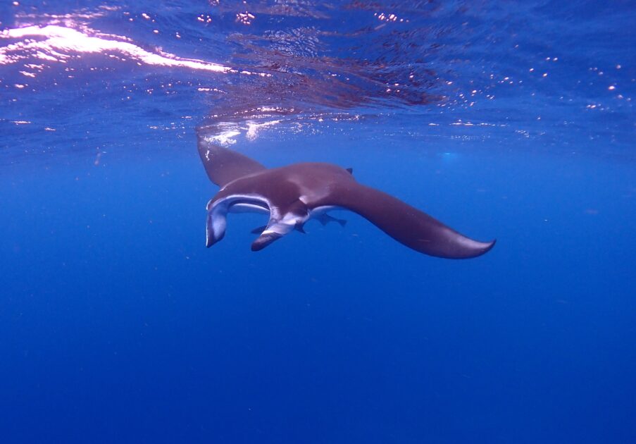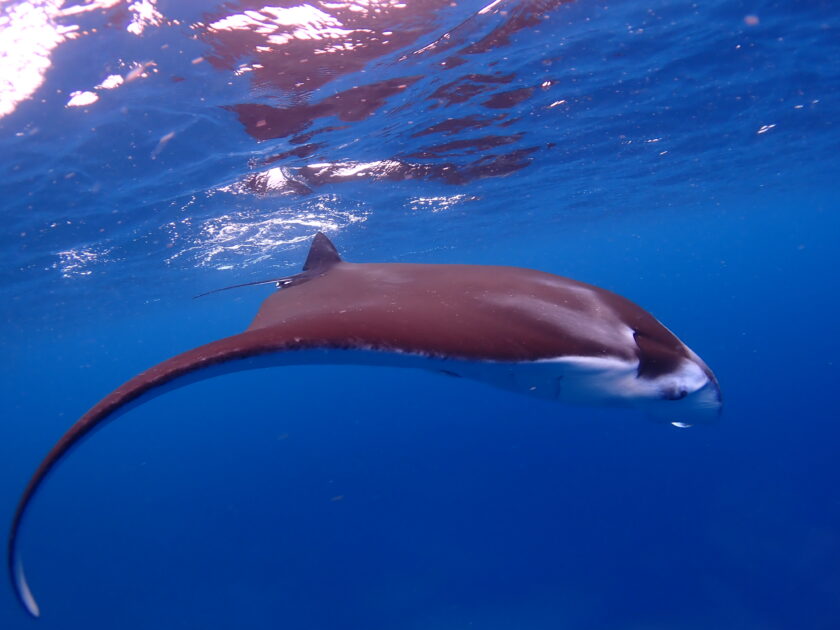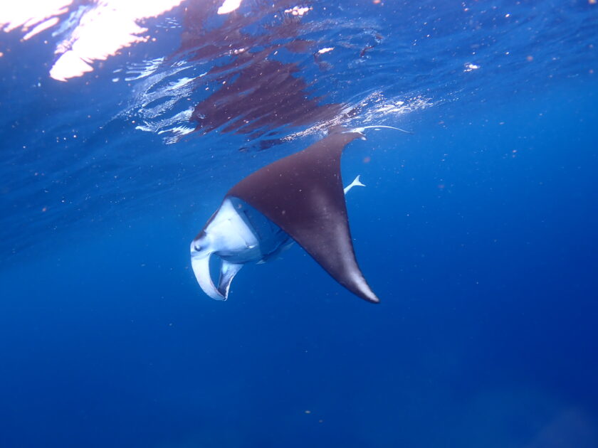 体長3〜4メートルはあるんかな?あんなに大きいのに、動きはとってもソフト。自然が生み出した造形美に、ただただ圧倒される時間でした! マンタが口の横にある「頭鰭(とうき)」を上手に使って