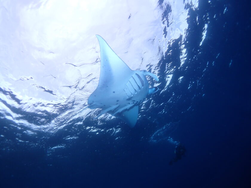 マンタを真下から見上げる贅沢ビューやぁ!お腹にある黒い斑点は、人間でいう指紋みたいなもので、個体識別もできちゃう!画面右下に小さく写るダイバーと比べると、マンタの大きさがよく分かるでしょ?